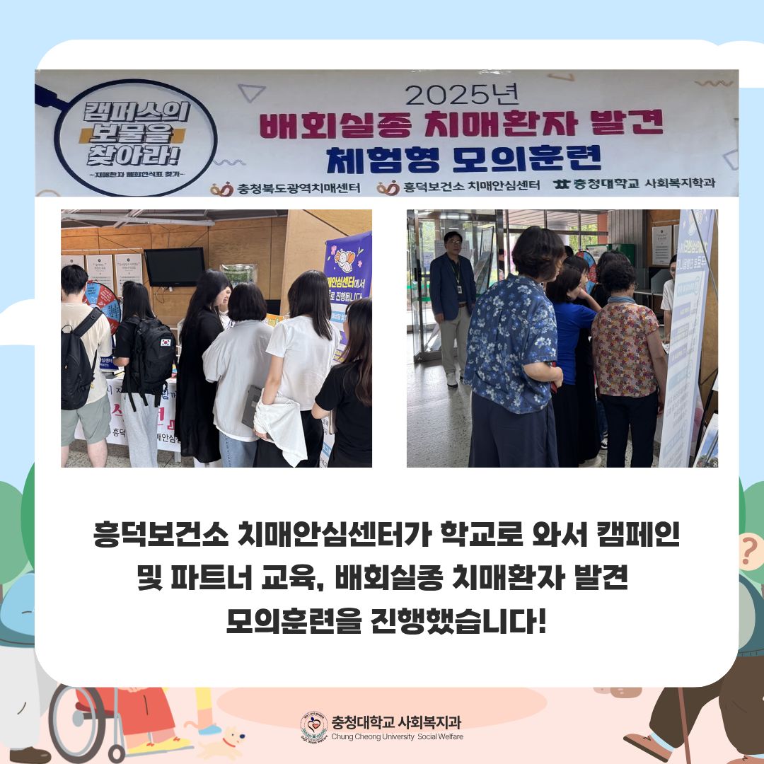 흥덕구보건소 치매안심센터가 충청대학교 사회복지과에 뜻깊은 행사와 함께 찾아왔습니다! 사회복지과 전학년을 대상으로 배회실종 치매환자 특강 및 파트너교육을 진행하고 일주일 동안 모의훈련을 통해 학생들이 실제상황에서도 힘을 쓸 수 있도록 했습니다 이번 활동을 통해 학생들이 사회에서 생활하며 시야를 넓히고 배운 것들을 실천하면 좋을 것 같습니다! |